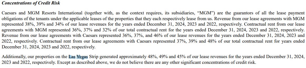That being said, nearly half of VICI’s lease revenue comes from Las Vegas. I didn’t find much that I would consider noteworthy in the 10-K. No smoking gun, just a lot of business as usual.