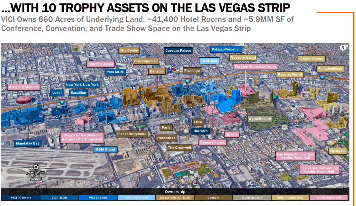 Since we’re talking about a REIT, I thought it would be valuable to show precisely which pieces of real estate VICI owns, as well as to highlight the point that many MGM and Caesars properties that VICI owns are not located in Las Vegas.