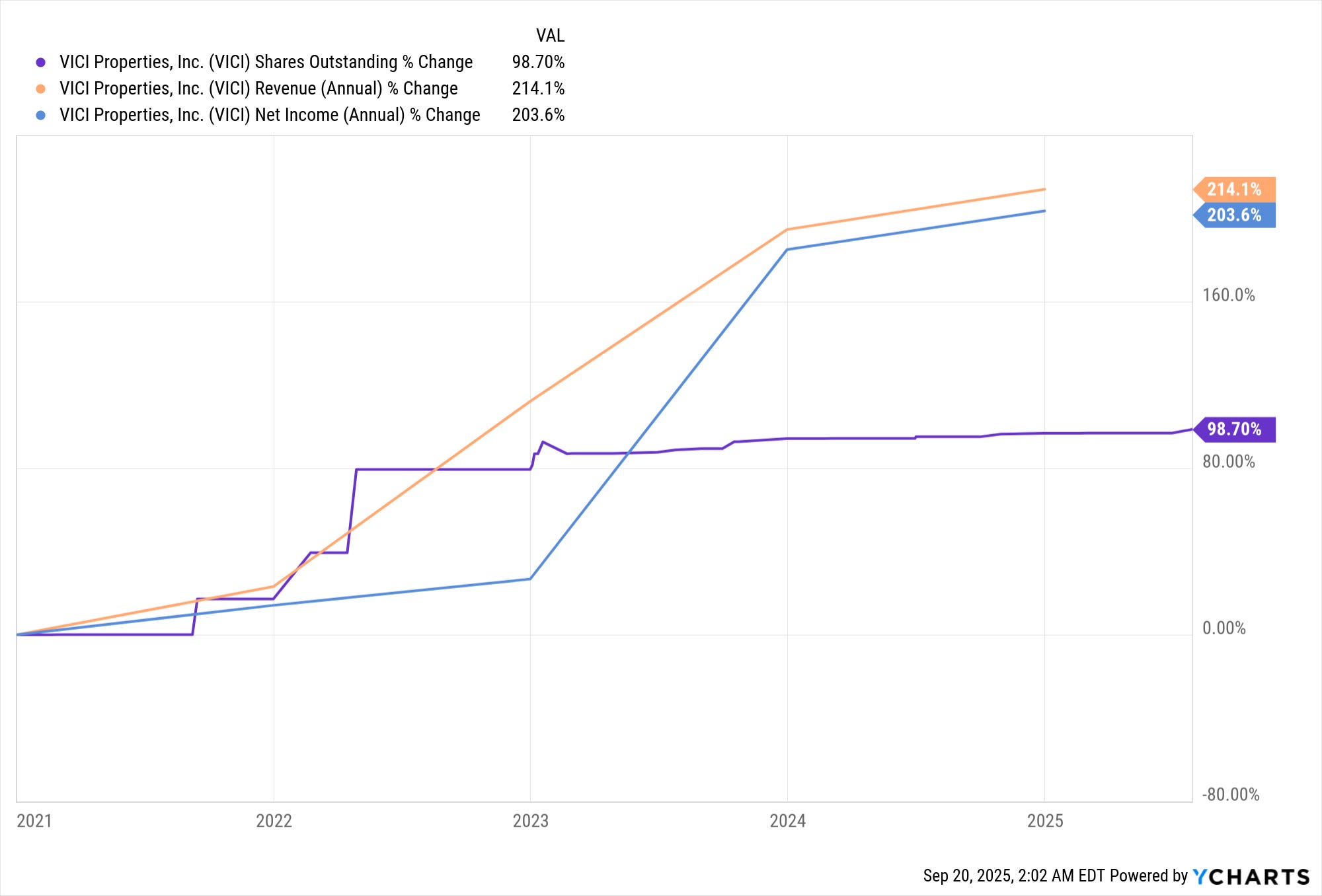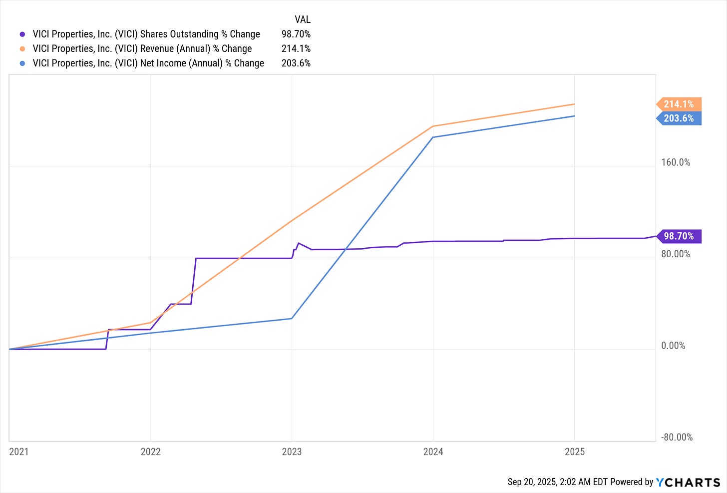 I think it is safe to say that VICI’s issuance of new stock has been a net positive for shareholders. Total return includes both share price increases and dividends issued, and it has been going up in tandem with shares issued. Increases in revenue and net income have vastly outpaced the increase in shares.