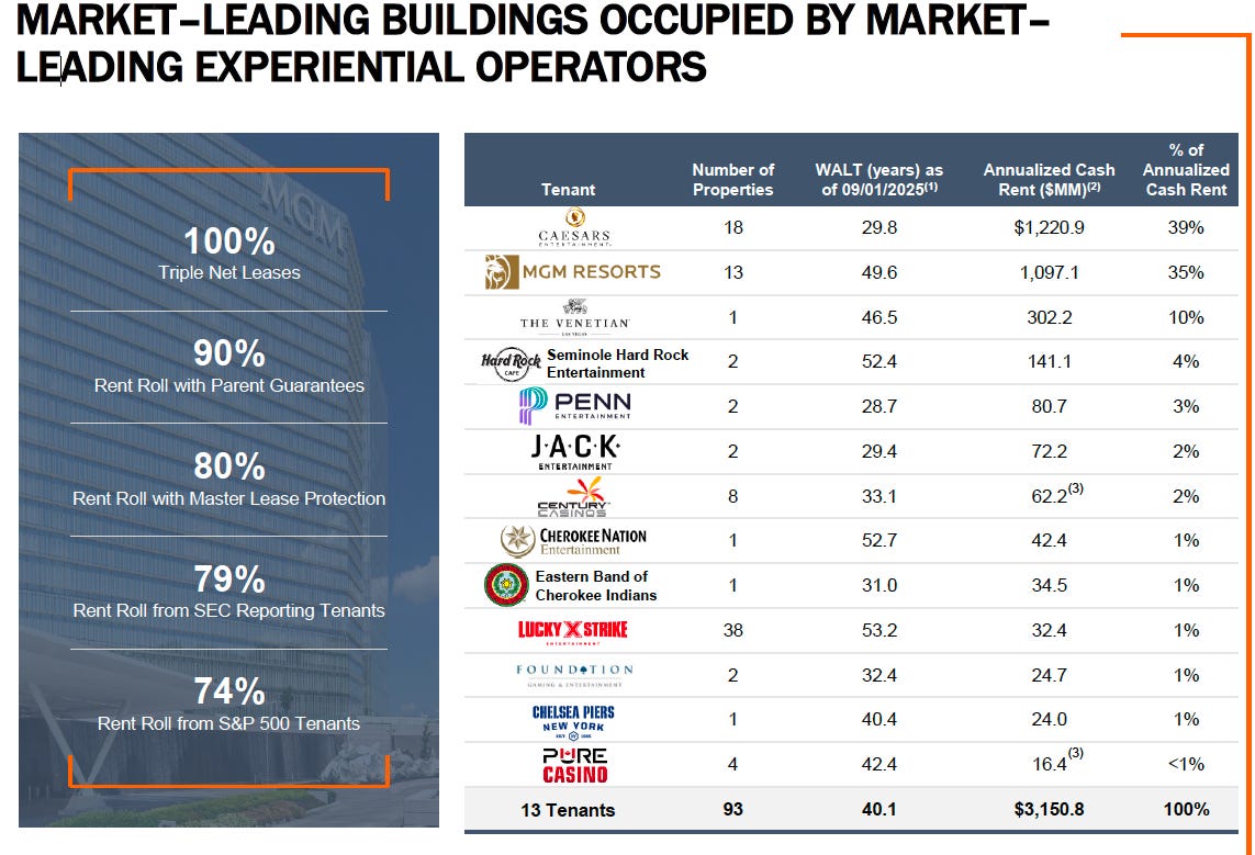 As you can see, VICI-owned properties appear in various shades of blue. They control a substantial amount of real estate on the Las Vegas Strip, and 74% of their revenue comes from MGM and Caesars properties. It is important to note that VICI has properties that extend beyond the Las Vegas Strip. They have NNN leases on 31 MGM and Caesars properties, many of which are not located on the Las Vegas Strip. I’m fine with this concentration for the same reason I was fine with investing in MGM.