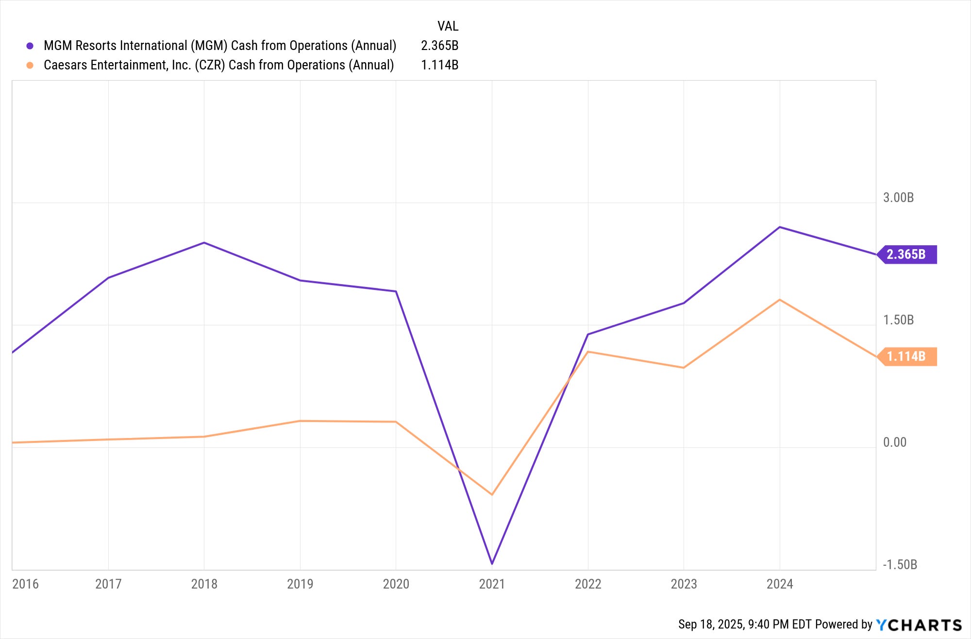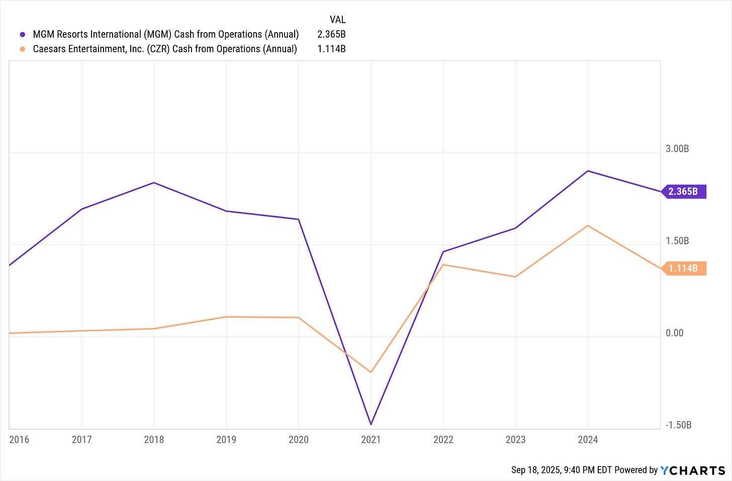 Currently, I’m beating the S&P 500 by 13% YTD, and I'm proud to say I've done it by being careful, not going all in on tech. I rotated out some of my investments: MGM became VICI, and SPG and MAS became OKE and PFBC. I’ve been busy lately, so it is going to take me some time to get around to writing about OKE and PFBC. To recap, I moved 65% of my money into bonds a couple of months before the market took a dive over tariff fears. Thus, I was able to buy in at the bottom of the market, having avoided much of the pain. My point is that my success came from being careful, and I intend to remain careful. In the case of MGM and VICI, I kept my exposure to gambling and leisure, particularly in Las Vegas, but I transitioned to a less volatile investment.
